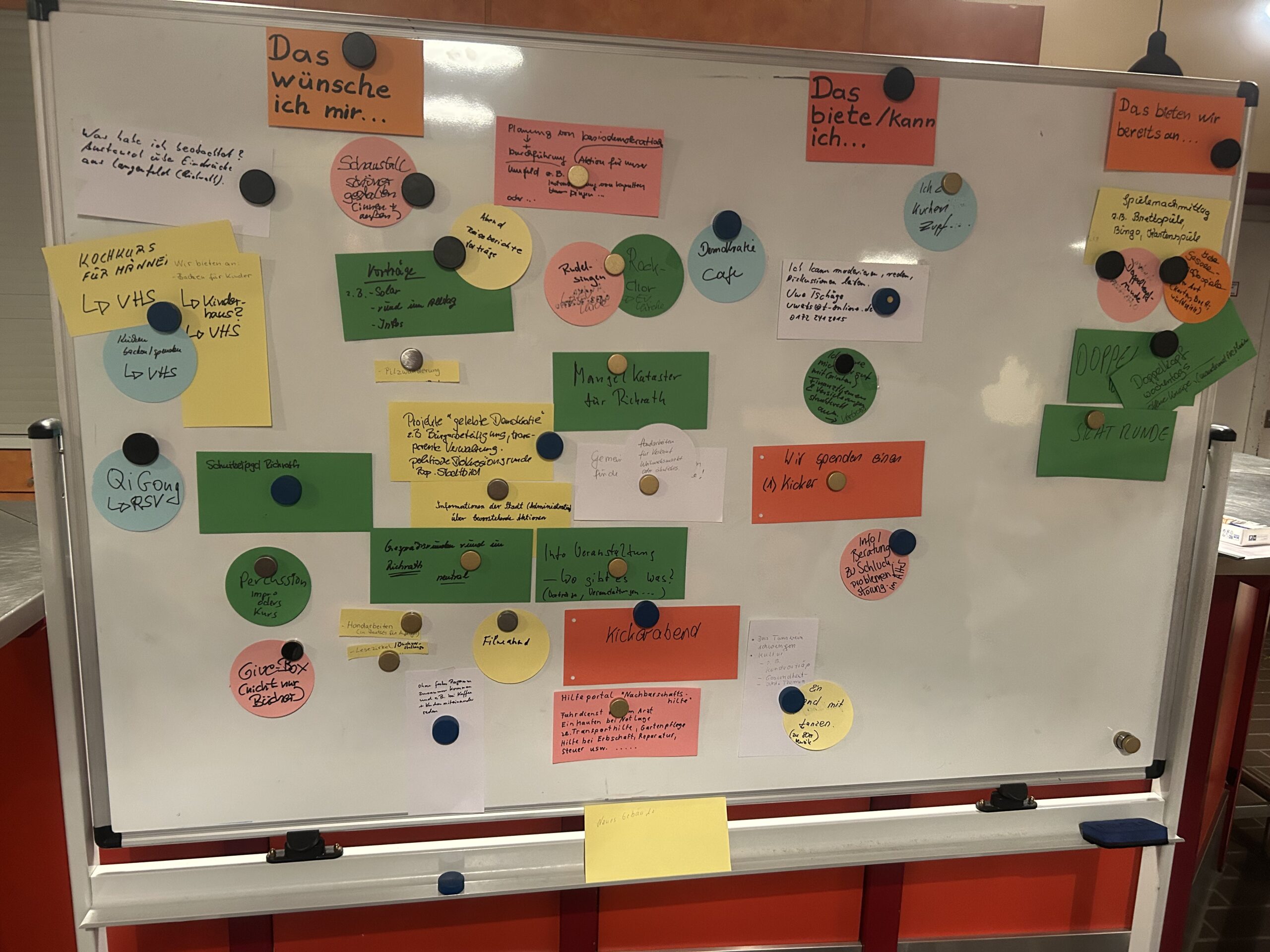 Bei der Eröffnung des Richrather Treffs haben viele Besucher ihre Ideen und Beiträge auf einer Pinnwand geteilt – geordnet nach drei Kategorien: „Das wünsche ich mir…“, „Das biete/kann ich…“ und „Das bieten wir bereits an…“. Am 10.12. um 17 Uhr wurden die Ideen vom Eröffnungstag mit Interessierten im Schaustall besprochen und ergänzt. Das Ergebnis zeigt ein lebendiges Bild unserer Nachbarschaft: voller Kreativität, Engagement und Lust auf Gemeinschaft. Das wünschen sich die Teilnehmer Die Besucher haben viele Wünsche für den Treff gesammelt. Besonders häufig genannt wurden: Lern- und Kreativangebote Kochkurse (z. B. über die VHS / für Männer / für Kinder)